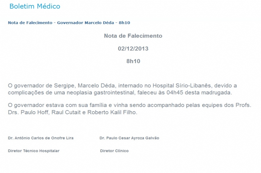Às 7h10 em Sergipe, o Hospital Sírio-Libanês divulgou nota sobre o falecimento do governador.