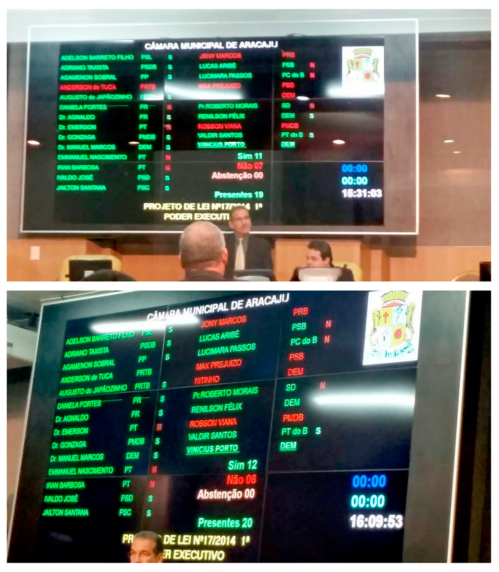 Por se tratar de matéria tributária, seria necessário o mínimo de 13 votos para aprovação. Na primeira discussão, com o voto contrário de Daniela Fortes, o projeto obteve 11 votos favoráveis e sete contrários. O Sim de Daniela, ainda na primeira votação, aumentou para 12 e o bloco governista acabou vitorioso com a chegada de última hora do vereador Anderson de Tuca, que chegou quando o processo de votação ainda estava em tramitação.