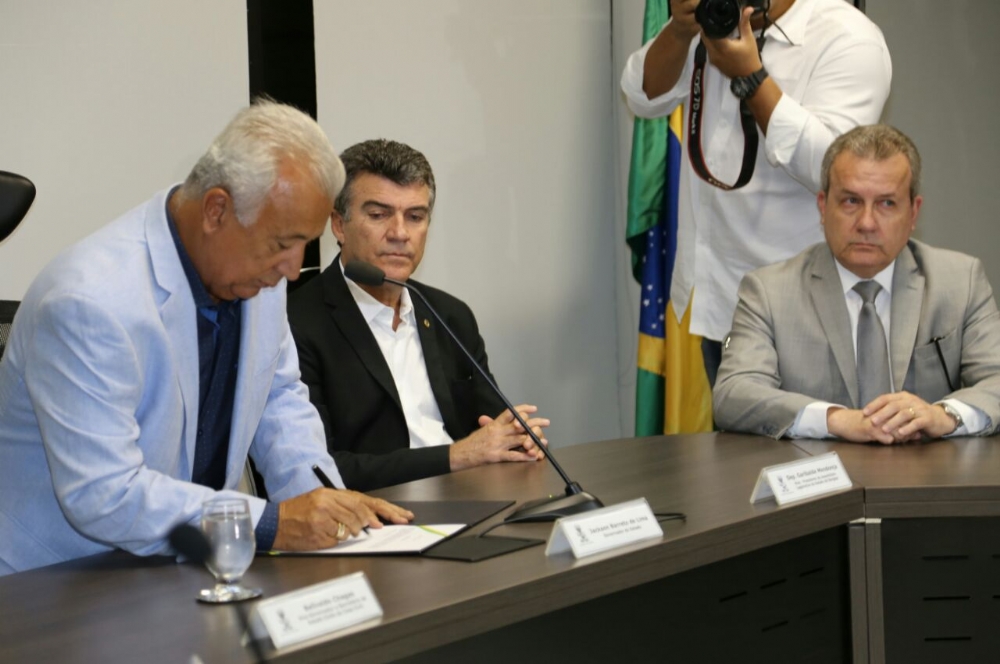 O governador Jackson Barreto assinou, nesta quarta-feira, 17, ordem de serviço para a construção de unidade prisional em regime semiaberto em Areia Branca. A solenidade contou com a presença do presidente do Tribunal de Justiça Sergipe, desembargador Cezário Siqueira, entre outros representantes do TJ/SE, assim como do procurador Eduardo Barreto D'Ávila, representando o Ministério Público Estadual (MPE/SE), da defensora chefe substituta da Defensoria Pública da União (DPU), Patrícia Vieira de Melo, e do deputado estadual e vice-presidente da Alese, Garibalde Mendonça, que representou o Poder Legislativo de Sergipe.