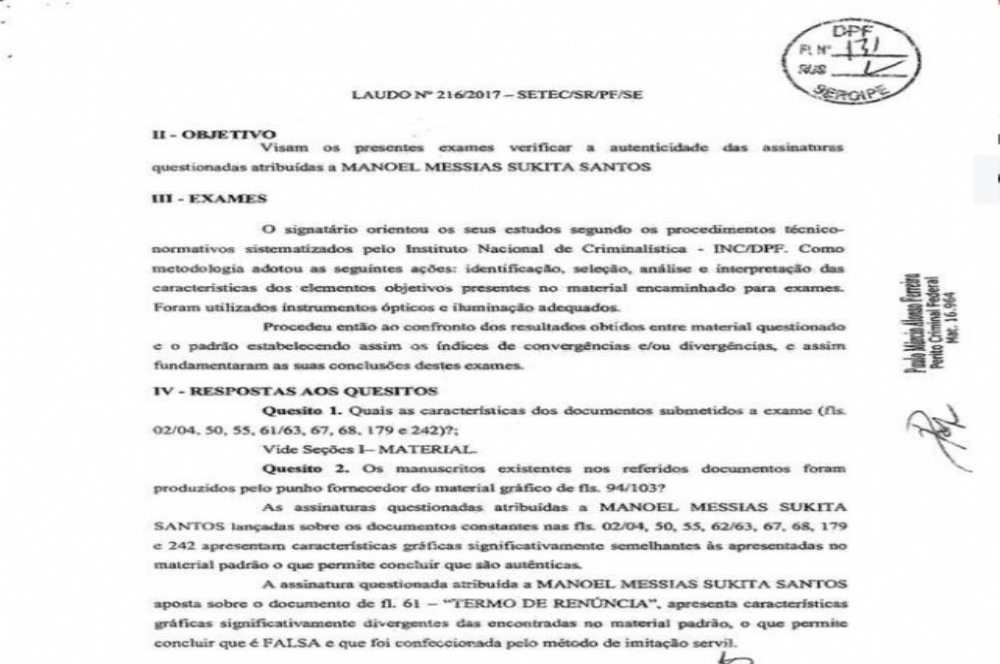 “A assinatura questionada atribuída a Manoel Messias Sukita aposta sobre o documento Termo de Renúncia apresenta características gráficas significativamente divergentes das encontradas no material padrão, o que permite concluir que é falsa e que foi confeccionada por método de imitação servil”, destaca parte do laudo divulgado pelo ex-prefeito de Capela.