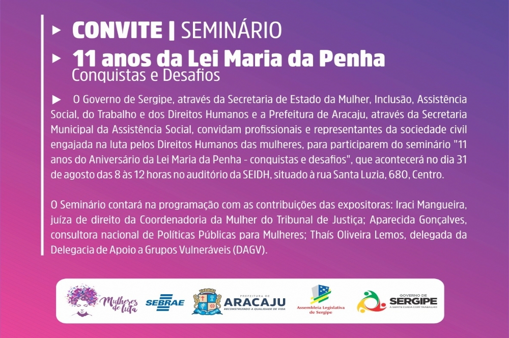 Encerrando as ações em alusão ao aniversário da Lei 11.340, promulgada em 07 de agosto de 2006, que tem como objetivo coibir e punir a violência contra a mulher, a Secretaria Municipal da Assistência Social de Aracaju, em parceria com a Secretaria de Estado da Mulher, Inclusão, Assistência Social, do Trabalho e dos Direitos Humanos (Seidh), realiza no próximo dia 31 de agosto o “Seminário 11 anos da Lei Maria da Penha – Conquistas e Desafios”. O evento é aberto ao público e acontecerá a partir das 9h no auditório da Seidh, localizada na rua Santa Luzia, 680, no Centro de Aracaju.