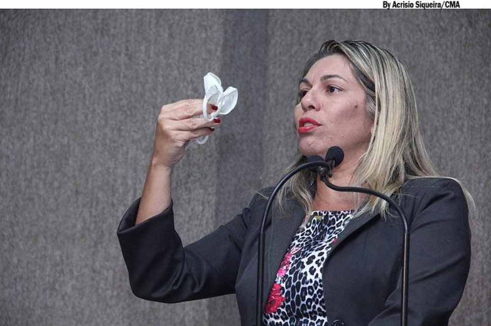 | Lucimara Passos destaca o combate à violência contra mulher ‘mostrando calcinha’ na Câmara (Foto: Acrísio Siqueira) |