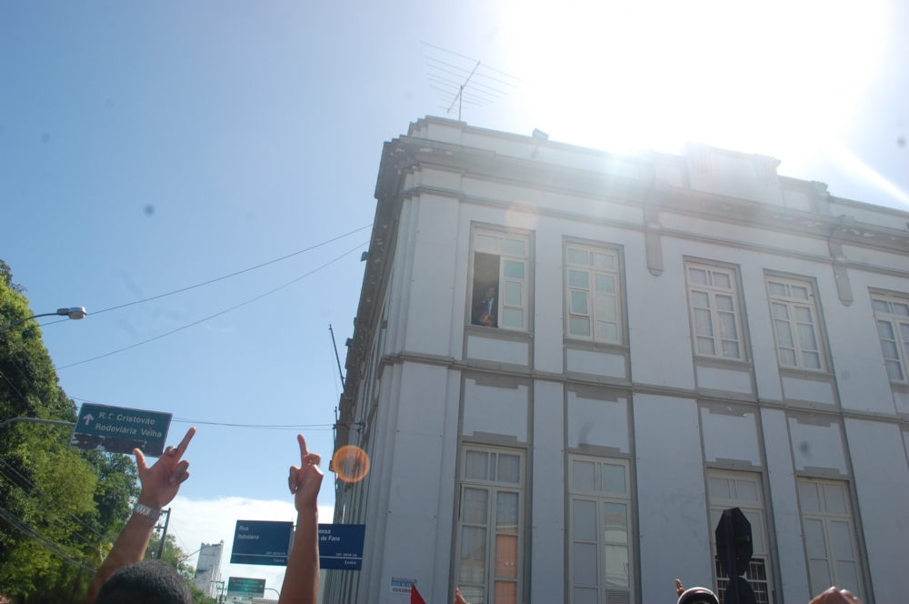 | Da janela, Agamenon manda beijos e inflama manifestantes que gritam e fazem gestos |
