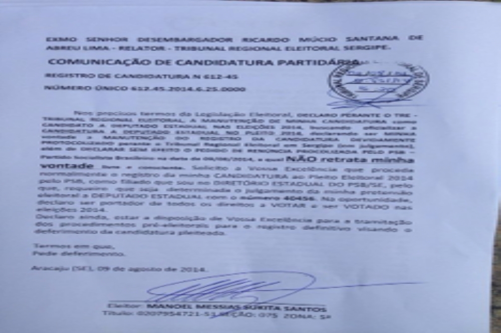 “Não retrata a minha vontade. Solicito a Vossa Excelência que proceda normalmente o registro da minha candidatura ao pleito 2014. Na oportunidade declaro ser portador de todos os diretos a votar e ser votado nas eleições 2014”, enfatiza Manoel Messias Sukita no documento enviado ao TRE/SE.