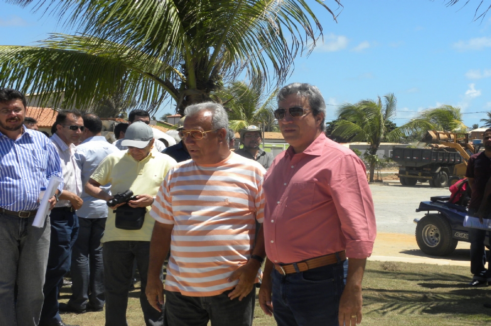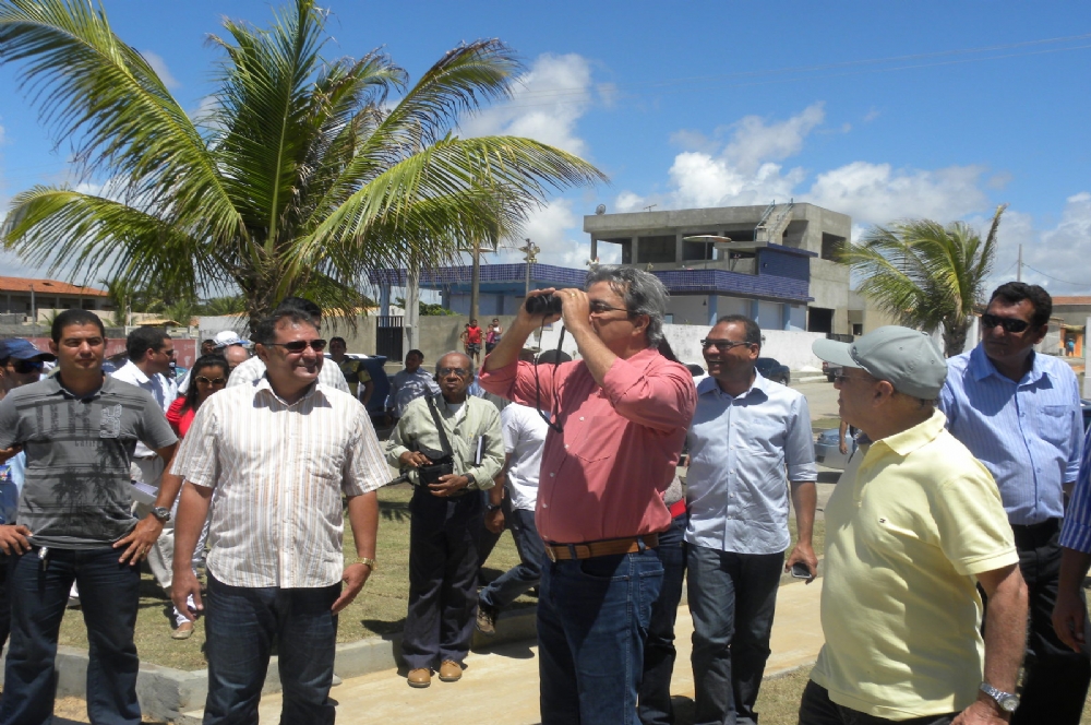 | Governador observa trabalhos pelo binóculo do senador Antônio Carlos Valadares |