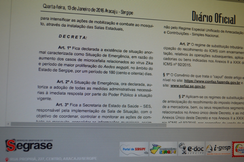 Foi publicado na edição desta quarta-feira, 13 no Diário Oficial, o Decreto 30.150, declarando a existência de situação anormal, caracterizada como Situação de Emergência, em razão do aumento dos casos de microcefalia, relacionados ao vírus Zika, por um período de 180 dias. Em Sergipe, já são 156 casos da doença que afeta bebês, a maioria de mães que foram infectadas pelo Zika Vírus.