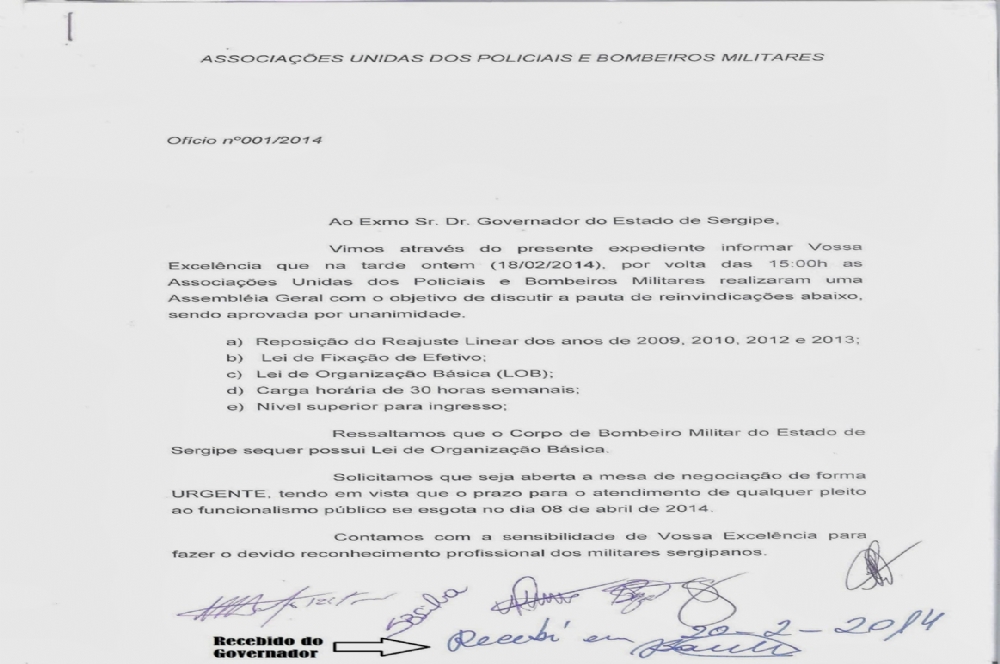 Na manhã da última quinta-feira, 20, as Associações Unidas dos Policiais e Bombeiros Militares do Estado de Sergipe, representadas pelo Sargento Vieira da Amese e pelo Major Adriano da Assomise, protocolaram ofício ao Governador do Estado de Sergipe, Dr. Jackson Barreto, no Palácio de Despachos, dando ciência da pauta de reivindicações da classe militar, que foi deliberada em Assembléia Geral realizada no dia 18 do corrente mês e ano.