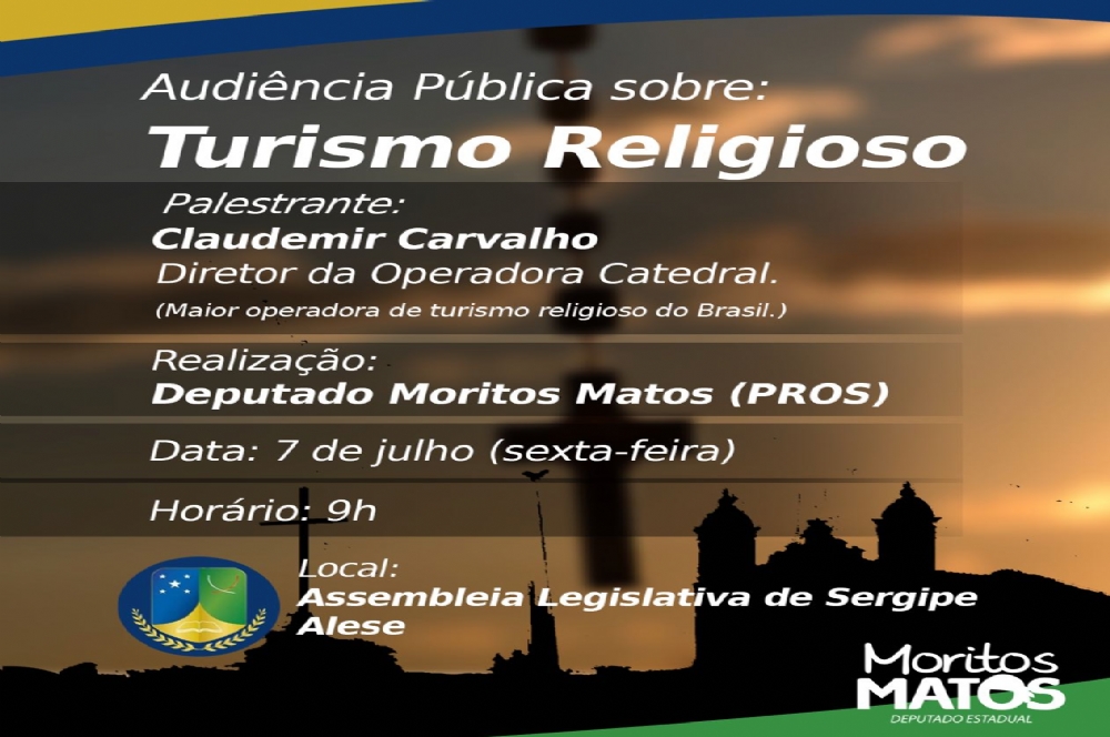 O parlamentar é o autor do Projeto de Lei – PL nº 26/2017 que dispõe sobre a instituição de diretrizes para o Turismo Religioso no Estado de Sergipe. “"Esse projeto tem como objetivo consolidar o turismo religioso no Estado. Por isso, convidei o diretor da Operadora Catedral, Claudemir de Carvalho, que virá de Campinas, para participar dessa Audiência. A Catedral é a maior operadora de Turismo Religioso do Brasil. Claudemir vai apresentar dados sobre a importância e os benefícios do Turismo Religioso para Sergipe”, enfatiza o deputado Moritos Matos.