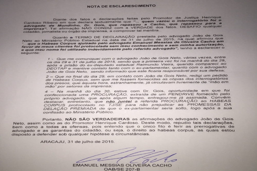 | Nota de esclarecimento enviada por Emanuel Cacho |