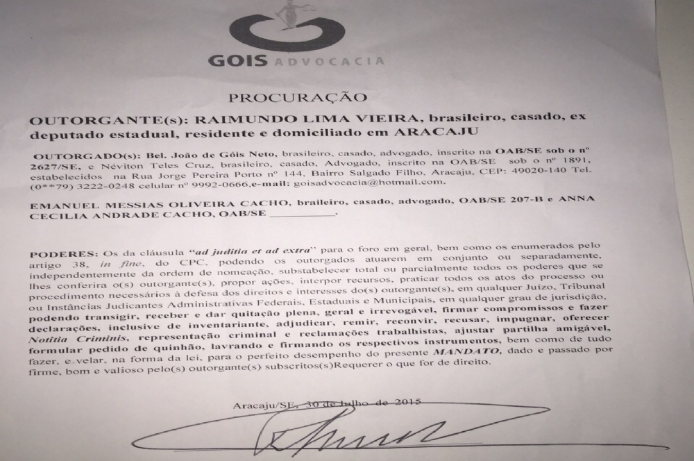 Já Cacho alega que se comunicou com o advogado por diversas vezes e revela que atuou com base em uma procuração assinada pelo próprio Mundinho da Comase. O documento contendo a procuração foi divulgado pelo advogado em redes sociais.