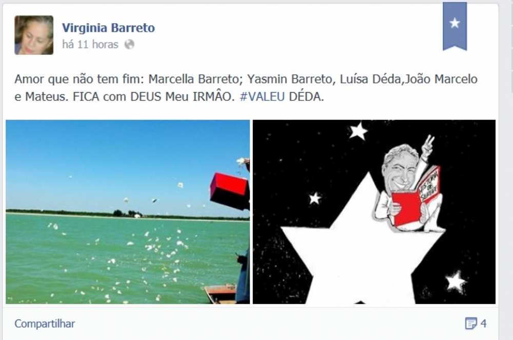 Em uma cerimonia restrita aos familiares parte das cinzas do governador Marcelo Déda foram jogadas no litoral sergipano. A imagem postada em uma rede social dos parentes de Marcelo Déda mostra que foram realizadas homenagens durante o ato. As cinzas foram jogadas na Praia do Saco, litoral de sergipe.