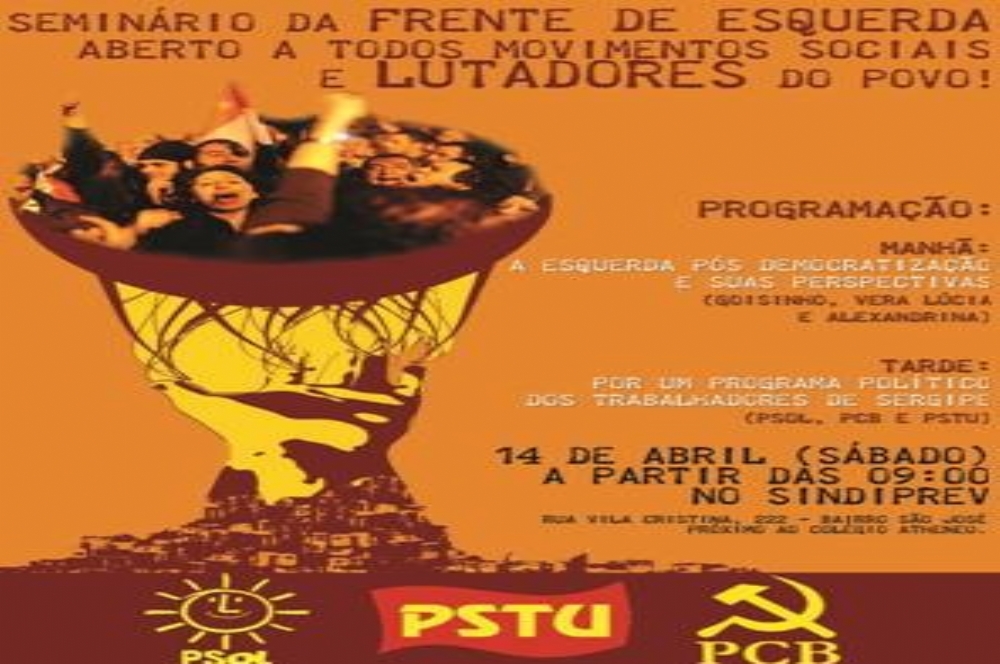 Na manhã deste sábado, 14, os partidos que compõem a “Frente de Esquerda” na capital sergipana – PSOL, PCB e PSTU – realizarão um seminário de organização e formação política. O evento ocorrerá no auditório do Sindsprev-SE , localizado na Rua Vila Cristina, bairro São José, e estará aberto a todos os interessados em construir um programa popular para Aracaju, contando com a presença de dezenas de militantes situados nas diversas áreas de atuação.