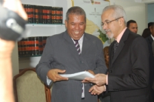 O gabinete do presidente da Câmara Municipal de Aracaju, Emmanuel Nascimento (PT) ficou pequeno na manhã desta quinta-feira, 18, quando da entrega do Orçamento da Prefeitura de Aracaju. Secretários, vereadores e profissionais da imprensa acompanharam o anúncio do prefeito Edvaldo Nogueira (PCdoB) dando conta de que o orçamento para 2011 é da ordem de R$ 1,065 bilhão. “Destes, R$ 305 milhões serão investidos na área da Saúde”. Emmanuel recebe o Orçamento 2011 das mãos do prefeito Edvaldo Nogueira (Foto: Portal Infonet)