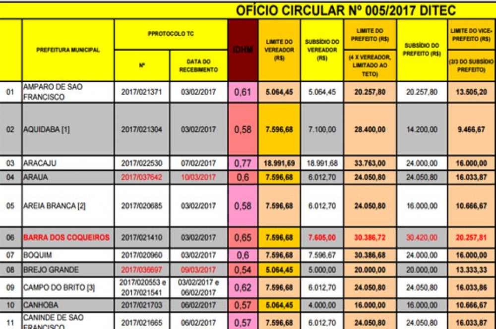 A Diretoria Técnica sugere que o TCE recomende a edição de ato normativo próprio para reduzir os subsídios e atingir o patamar constitucional e envio de ofício às Câmaras Municipais da Barra dos Coqueiros e de Carira e às Prefeituras Municipais de Areia Branca, Barra dos Coqueiros, Ilha das Flores, Malhador, Nossa Senhora da Glória e Siriri, fixando prazo de 45 dias para que prestem informações sobre as medidas adotadas para a regularização dos valores ao patamar constitucional.