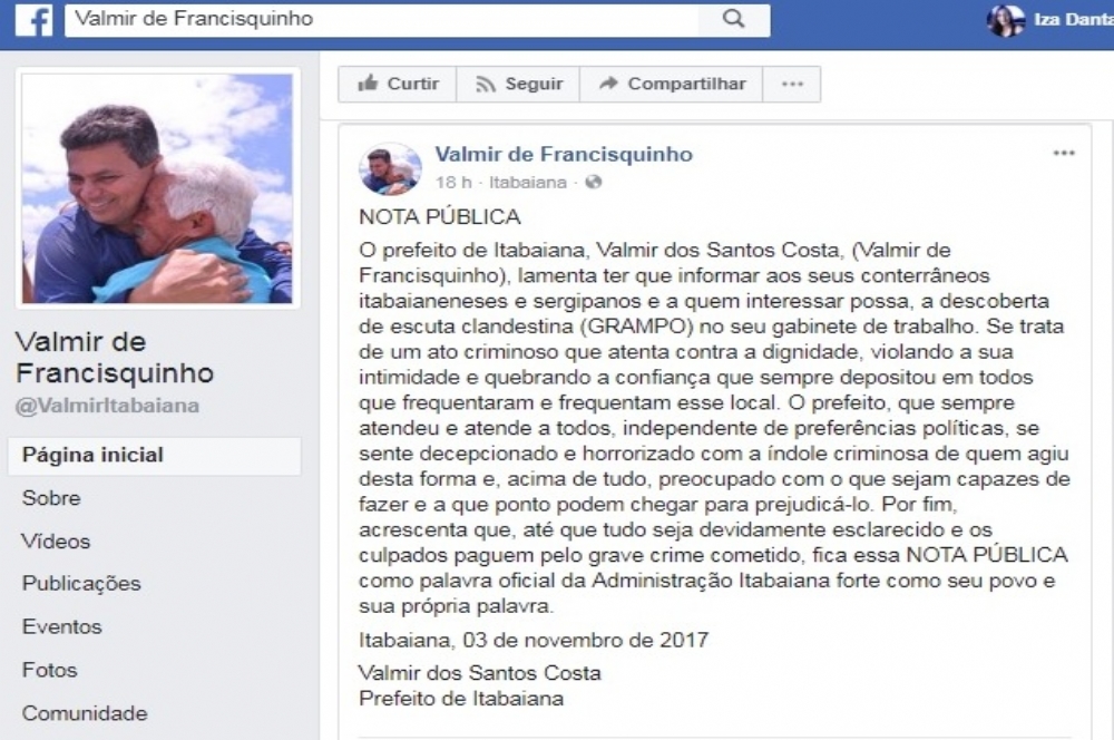 O prefeito de Itabaiana Valmir dos Santos Costa (PR), mais conhecido como Valmir de Francisquinho utilizou uma rede social para denunciar ter sido vítima de escuta clandestina [grampo] no seu gabinete de trabalho.