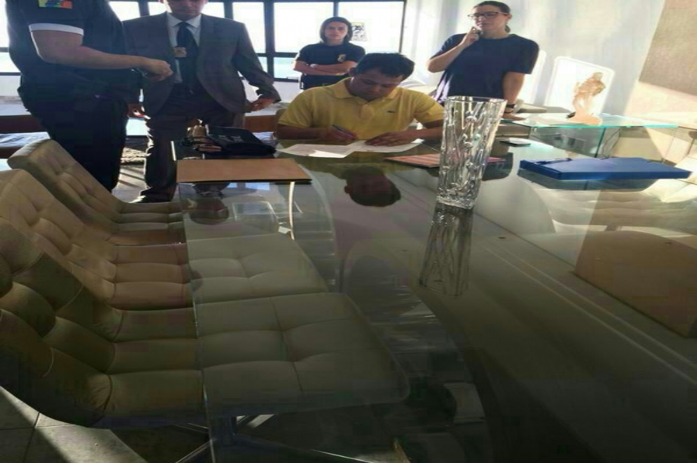 | Momento em que Sukita assina mandado no apartamento (Foto divulgada nas redes sociais) |