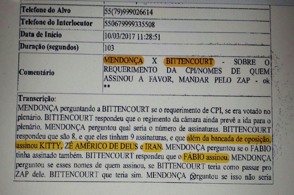 Conforme um dos documentos vazados, em trechos da transcrição de uma conversa por telefone que durou em torno de um minuto e meio, Mendonça queria saber se a votação da CPI iria a plenário. Em sequência, teria perguntado quantas assinaturas seriam precisas para aprovação, e quantas tinham. Bittencourt teria respondido que precisariam de oito, e já se tinham nove assinaturas. Por fim, Mendonça perguntou se os nomes dos vereadores que assinaram, poderiam ser passados via whatsapp, e Bittencourt respondeu positivamente.