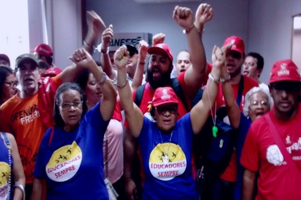 | Momento em que professores e aposentados ocupavam o Palácio Despachos (Foto: Caroline Santos/Ascom Sintese) |