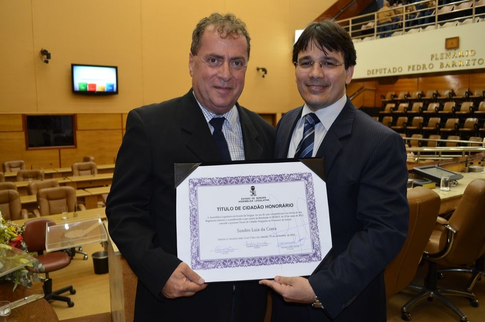 Foi realizada na tarde de ontem, 05, durante sessão especial na Assembleia Legislativa, a entrega do título de cidadania sergipana concedida ao Promotor de Justiça Sandro Luiz da Costa. O autor da homenagem foi o deputado estadual Zé Franco (PDT), que não poupou elogios ao magistrado. “Dr. Sandro da Costa é um homem íntegro, sem dúvida um dos mais atuantes promotores de justiça do nosso Estado. Essa homenagem, para mim, é muito merecida”, disse o parlamentar.