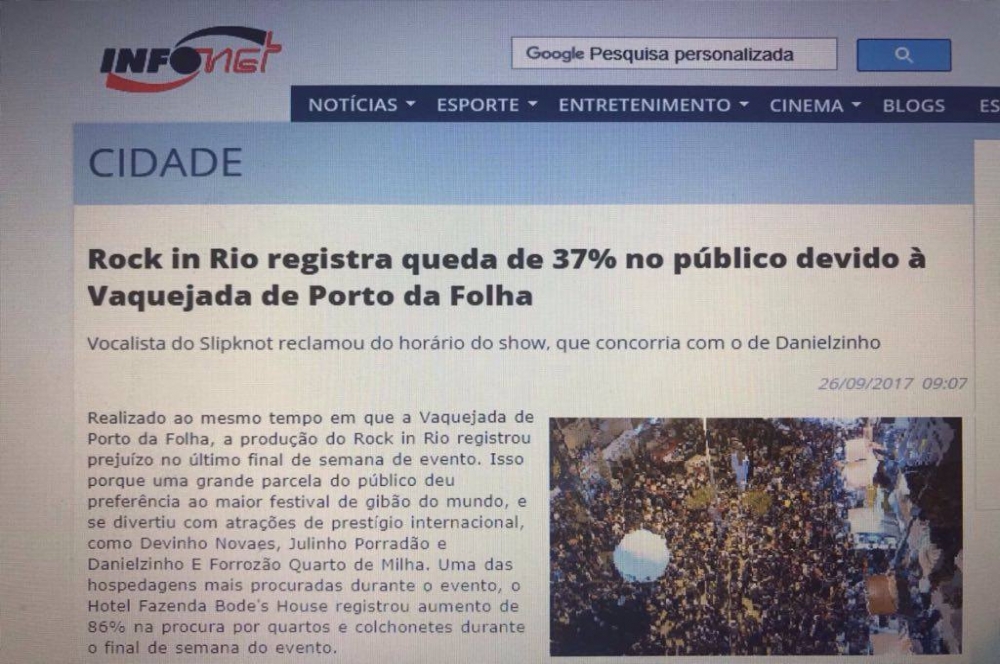 Outro caso envolve diretamente o Portal Infonet: circulou em redes sociais uma notícia falsa, supostamente publicada no site no dia 26 de setembro do ano passado, com o título ‘Rock In Rio registra queda de 37% no público devido à vaquejada de Porto da Folha’. “A pessoa teve todo um trabalho em criar uma arte igual ao nosso layout para divulgar um conteúdo falso, e a mesma viralizou nas redes sociais. Como não levamos esse material a sério, fizemos uma brincadeira em nosso Facebook, mas o perigo é que algumas pessoas nem se dão ao trabalho de ir verificar se existe essa matéria em nosso site e muitas vezes entendem como conteúdo verdadeiro”, preocupa-se a editora do site, Raquel Almeida.