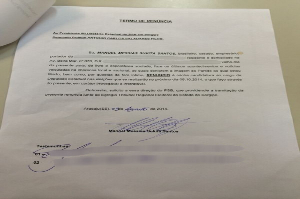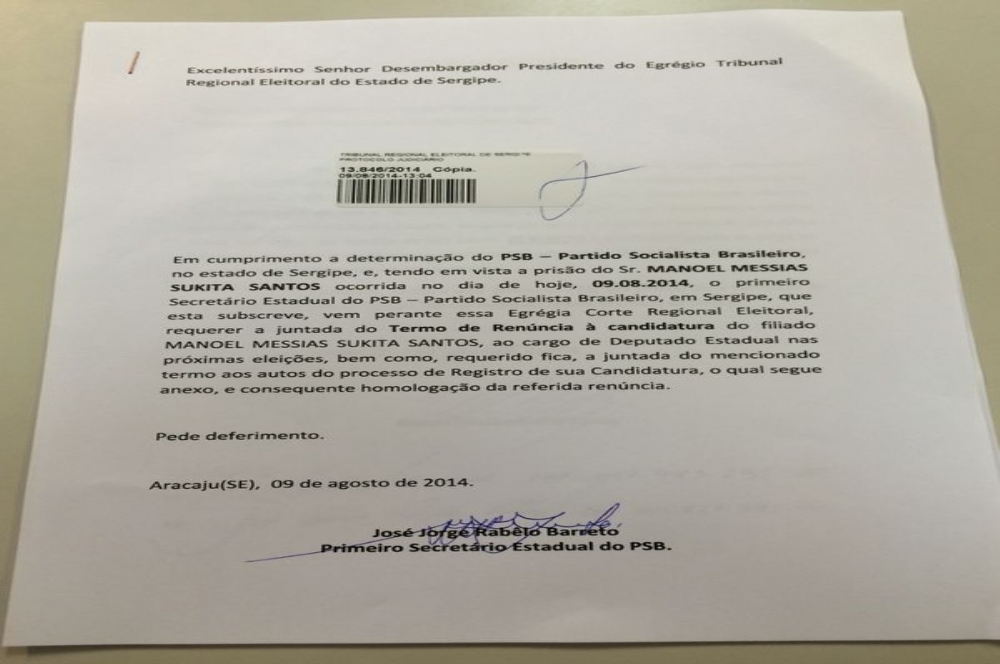 O primeiro secretário do Partido Socialista Brasileiro (PSB), Jorge Rabelo, requereu por volta das 13h deste sábado, 09, junto ao Tribunal Regional Eleitoral, o pedido de renúncia à candidatura de deputado estadual do ex-prefeito de Capela, Manoel Messias Sukita.