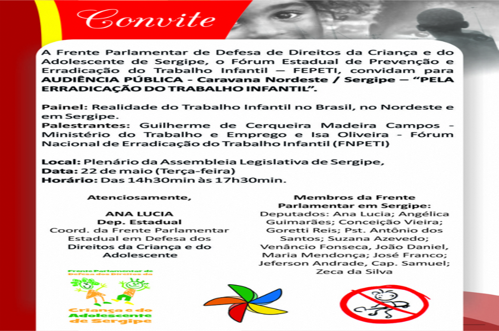 Na próxima terça-feira, dia 22/5, a partir das 14h30, a realidade do trabalho infantil no Brasil, no Nordeste e em Sergipe será tema de audiência pública na Assembleia Legislativa. A audiência integra o calendário de ações da Caravana do Nordeste contra o Trabalho Infantil, que passará por Sergipe no período de 21 a 25 de maio.