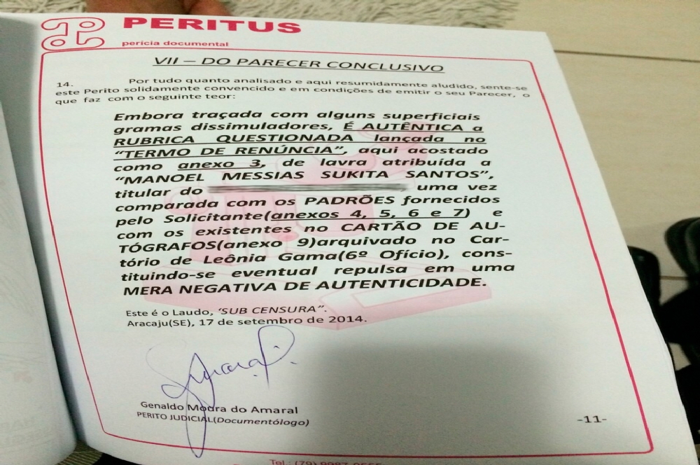 De acordo com o documento, “é autêntica a rubrica questionada lançada no Termo de Renúncia, aqui acostado com anexo 3, de lavra atribuída a Manoel Messias Sukita, constituindo-se em eventual repulsa a uma mera negativa de autenticidade”.