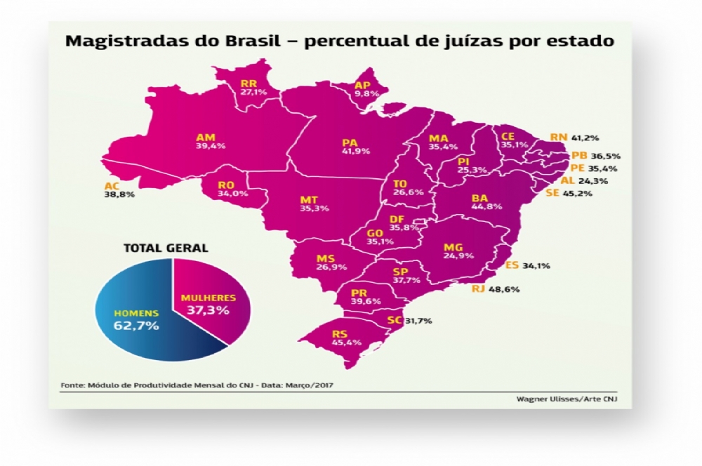 Além destes, outros sete estados têm um percentual maior de mulheres na magistratura do que a média nacional: Acre (38,8%), Amazonas (39,4%), Bahia (44,8%), Pará (41,9%), Paraná (39,6%), Rio Grande do Norte (41,2%) e São Paulo (37,7%). Já o Amapá é o estado com a menor participação de mulheres no total de magistrados: 9,8%.
