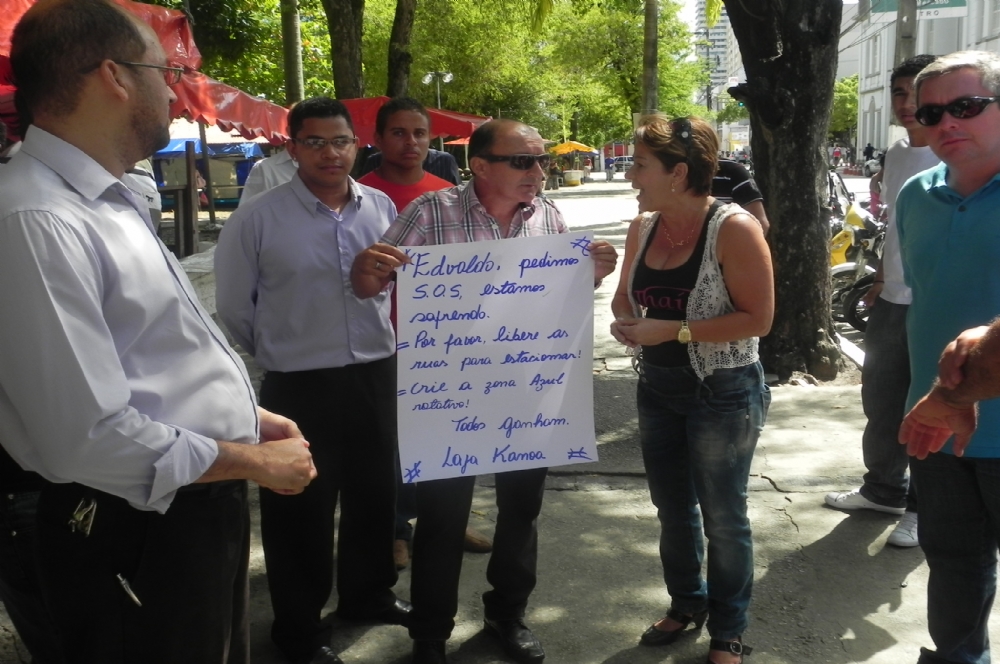 Empresários do setor do comércio fizeram um ato na manhã desta segunda-feira, 7, na porta da Câmara Municipal de Aracaju. O objetivo foi chamar a atenção da sociedade e dos vereadores quanto à medida da Superintendência Municipal de Transporte e Trânsito (SMTT) proibindo o estacionamento desde a rua Cedro até a rua Apulcro Mota. A categoria alega queda de até 60% nas vendas e cobra a volta dos parquímetros.