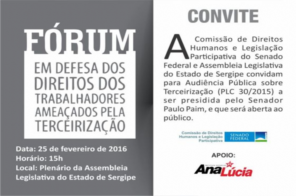 A iniciativa é da Comissão de Direitos Humanos e Legislação Participativa do Senado Federal, com o apoio do mandato democrático e popular da deputada estadual Ana Lúcia, e será realizada no Plenário da Assembleia Legislativa, às 15h. Debates similares já foram realizados em vinte e quatro estados, por iniciativa do Fórum de Defesa dos Direitos dos Trabalhadores Ameaçados pela Terceirização e da CDH do Senado