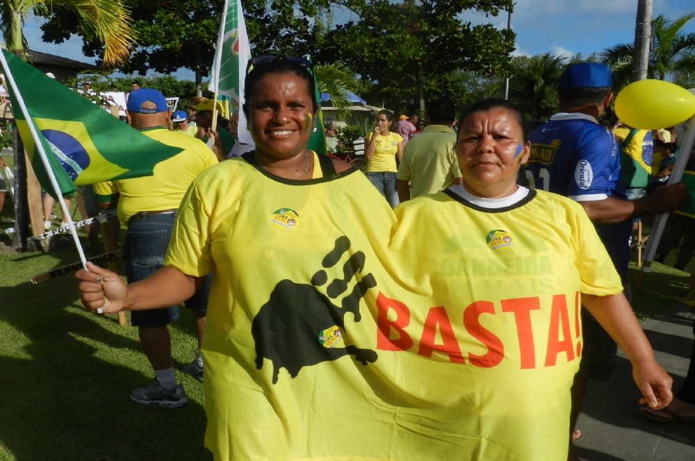 As amigas Simone Espinheira Alves e Gilmara Vieira participaram do ato. “Estamos participando porque acho que está tudo errado, porque a saúde e a educação estão indo tudo para o buraco. Tem que mudar tudo e a gente por para fora o PT”, pedem.