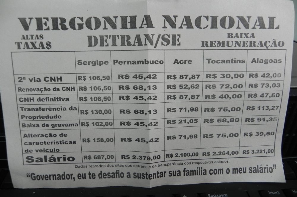 E o pior é que em funções diferenciadas. Temos casos de estagiária de Nutrição estar entregando documentos. Recebemos o menor salário do país. No Estado de Alagoas, por exemplo, os servidores do Detran recebem 300% a mais do que a categoria de Sergipe”, enfatiza o sindicalista.
