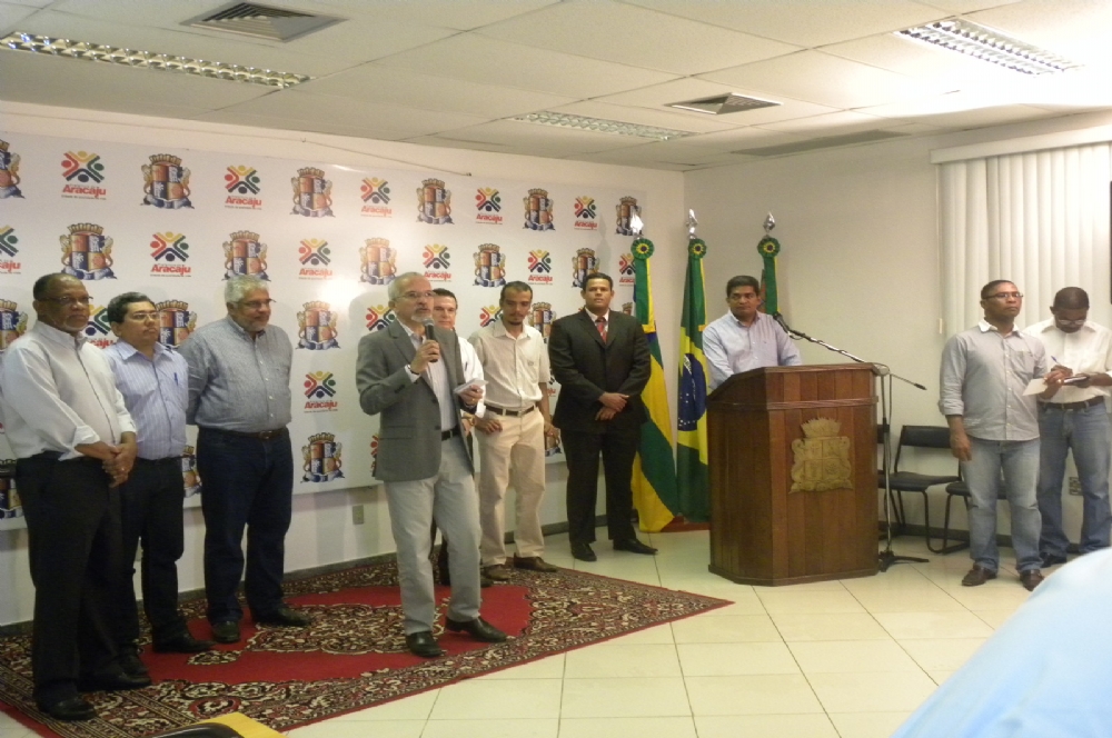 | Prefeito Edvaldo Nogueira faz o anúncio ao lado de secretários e sindicalistas (Fotos: Portal Infonet) |
