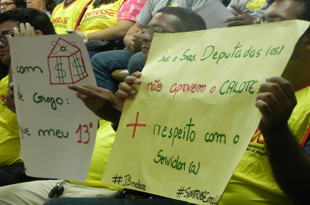 O Projeto de Lei 116/2015 do governo do Estado, que trata sobre o empréstimo e parcelamento do 13º salário de todas as classes de trabalhadores do serviço público, foi alvo de protestos na tarde desta segunda, 14. Representantes de sindicatos dos servidores ocuparam a bancada da Assembleia Legislativa para pedir aos deputados que não aprovem o projeto. “Da forma como está o projeto é a legalização de um calote do governo contra o servidor público estadual porque não temos garantia alguma que será pago o 13º em 2015”, dispara o diretor do Sindicato dos Trabalhadores na Educação do Estado de Sergipe (Sintese), Roberto Silva. O projeto foi discutido , mas não entrou em votação nessa segunda, ficando para ser apreciado pelos parlamentares nesta terça, 15.