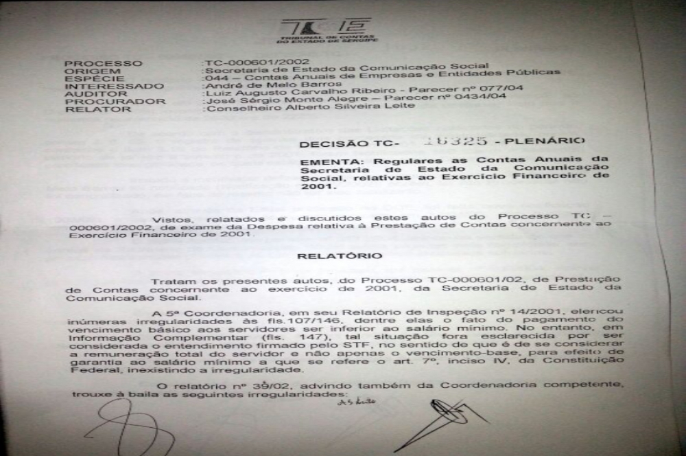 O ex-Secretário de Estado da Comunicação Social, André de Melo Barros, foi condenado pela Primeira Câmara do Tribunal de Contas do Estado (TCE/SE) a ressarcir ao erário o montante de R$ 728.522,05, em virtude de irregularidades apontadas pela equipe técnica do órgão através de Relatório de Inspeção referente ao período de janeiro a setembro de 2001. Em nota, André Barros informou que "as contas relativas ao periodo de 2001 já foram julgadas Regulares pelo Pleno do TCE".