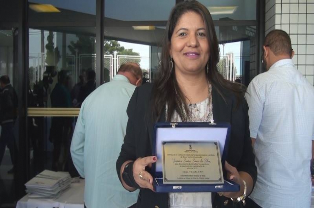 | Prefeita de N. Senhora Aparecida exibe placa recebida em homenagem do TCE (Foto: Portal Infonet) |