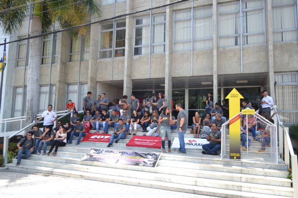 Os funcionários, vinculados ao Sindicato dos Trabalhadores do Poder Judiciário de Sergipe (Sindijus), estão em ‘acampamento’ na entrada do tribunal, aguardando novidades do pleno por meio de um representante.
