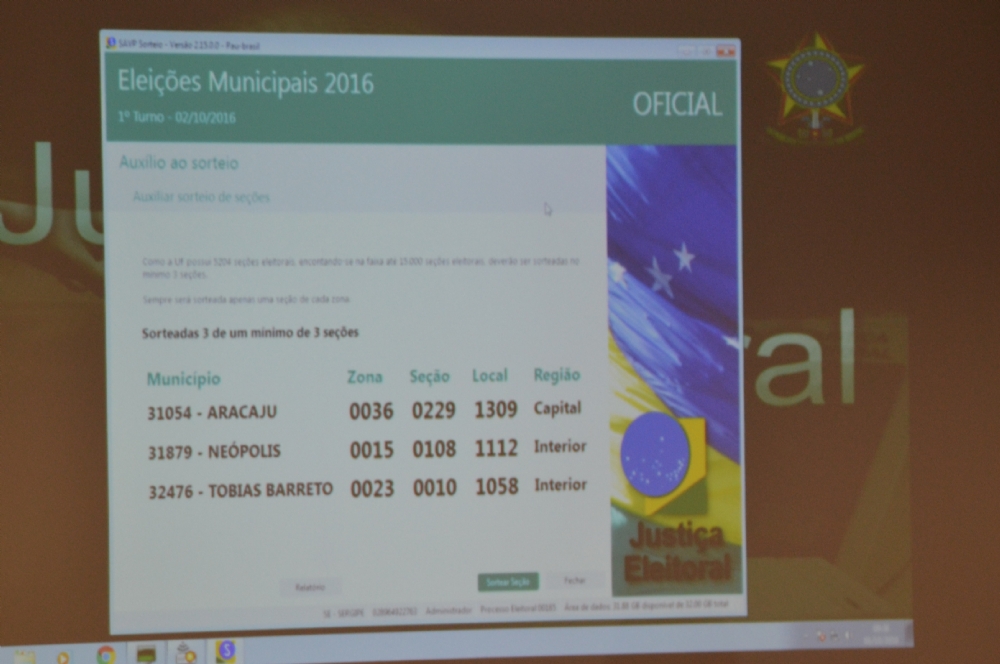 Na manhã deste sábado, 1º, faltando apenas um dia para o processo eleitoral 2016, acontece o sorteio da Votação Paralela na sede do Tribunal Regional Eleitoral (TRE/SE). O processo ocorre tranquilamente com o sorteio de três urnas, sendo duas seções no interior e uma na capital.