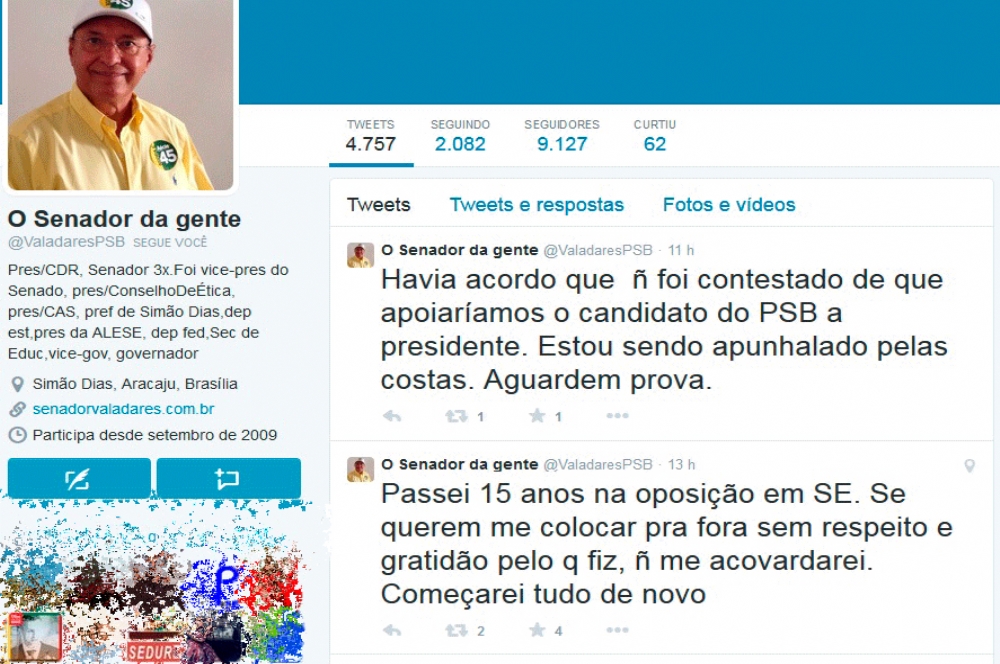 O desabafo de Valadares é por conta de ter recebido algumas críticas por ter optado pelo apoio a Aécio Neves, mesmo o diretório nacional do PSB ter deixado os diretórios estaduais livres para apoiar a candidata do PT ou do tucano.