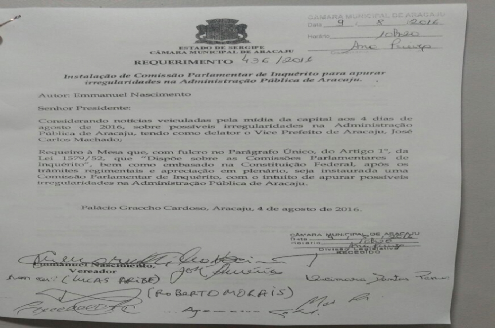O vereador Emmanuel Nascimento (PT) já conseguiu o número de vereadores suficiente e nesta terça-feira, 9, já formulou oficialmente pedido para instalação de Comissão Parlamentar de Inquérito (CPI) para investigar o áudio no qual o vice-prefeito José Carlos Machado (PSDB) sugere a existência de pessoas desonestas entre os assessores do prefeito João Alves Filho (DEM), interessadas apenas “em roubar” os cofres da Prefeitura de Aracaju.