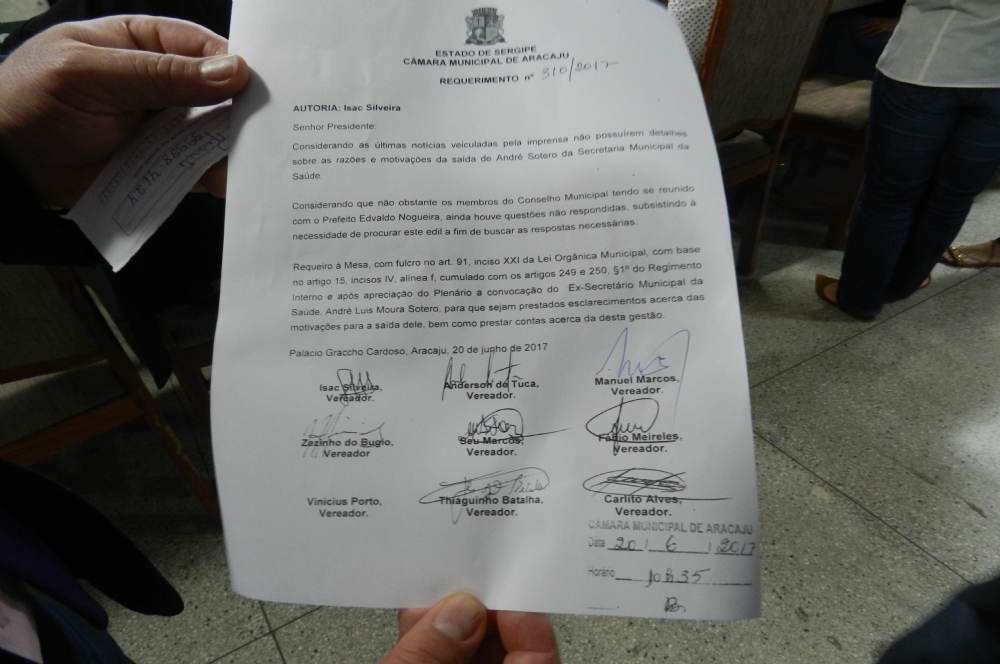 O pedido de exoneração do ex-secretário Municipal de Saúde, André Sotero, rendeu perplexidade também na Câmara dos Vereadores. É tanto que no expediente desta terça-feira, 20, oito vereadores assinaram requerimento de autoria do parlamentar Isac Silveira (PC do B) solicitando apreciação dos demais vereadores para convocar o ex-secretário a Casa Legislativa. O intuito é que o antigo gestor da Saúde explique os reais motivos do seu pedido de exoneração da pasta.
