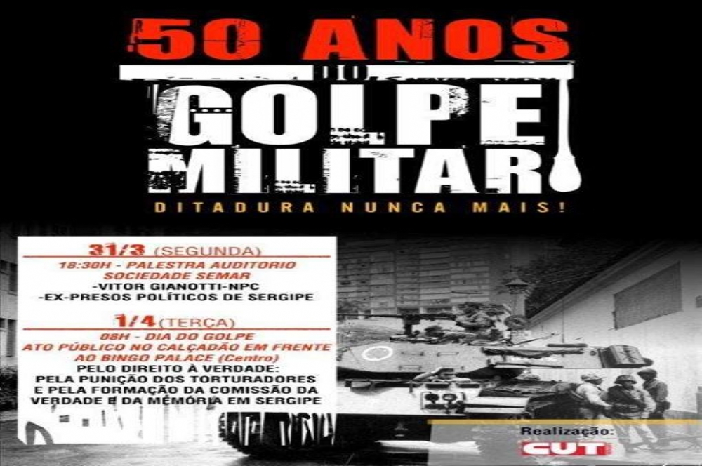 Para marcar os 50 anos do Golpe de Estado que instaurou a Ditadura Militar no Brasil, responsável pela prisão, morte,tortura e extradição de artistas, jornalistas e militantes sociais, a Central Única dos Trabalhadores (CUT/SE) realizará manifestação pública e debate ‘Pelo Direito à Verdade e à Memória’.