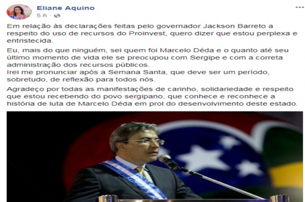 Causaram perplexidade à viúva Eliane Aquino (PT), vice-prefeita de Aracaju, as declarações do governador Jackson Barreto (PMDB) quanto ao destino dado pelo ex-governador Marcelo Déda (PT) aos recursos do Proinvest, que deveriam ser aplicados em obras. Segundo o governador Jackson Barreto, o ex-governador Marcelo Déda teria usado estes recursos para pagamento dos salários dos servidores.