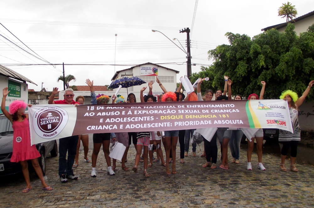 Com faixa, apitos, cartazes, panfletos e muita disposição, apesar da chuva fria que caia na manhã dessa sexta, as adolescentes da unidade de acolhimento Izabel Abreu, que integra a Fundação Renascer, saíram às ruas do bairro Ponto Novo para chamar a atenção da vizinhança para o 18 de Maio – Dia Nacional de Enfrentamento ao Abuso e à Exploração Sexual de Crianças e Adolescentes.
