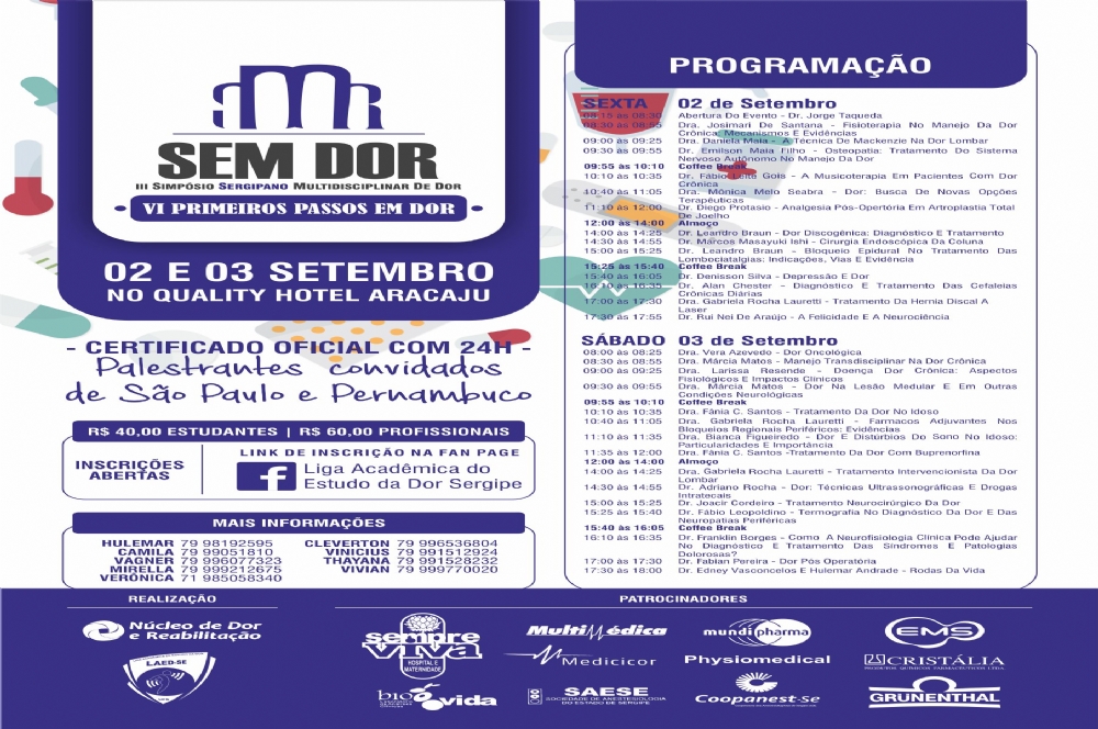 O III Simpósio Sergipano Multidisciplinar de Dor que será realizado pelo Núcleo de Dor e Reabilitação e pela Liga Acadêmica de Estudo para Dor de Sergipe (Laedse) o mesmo ocorrerá nos dias 02 e 03 de setembro no Hotel Quality Aracaju com o objetivo de aprimorar os conhecimentos sobre Dor no Estado de Sergipe. O púbico do evento são acadêmicos e profissionais da área de saúde.