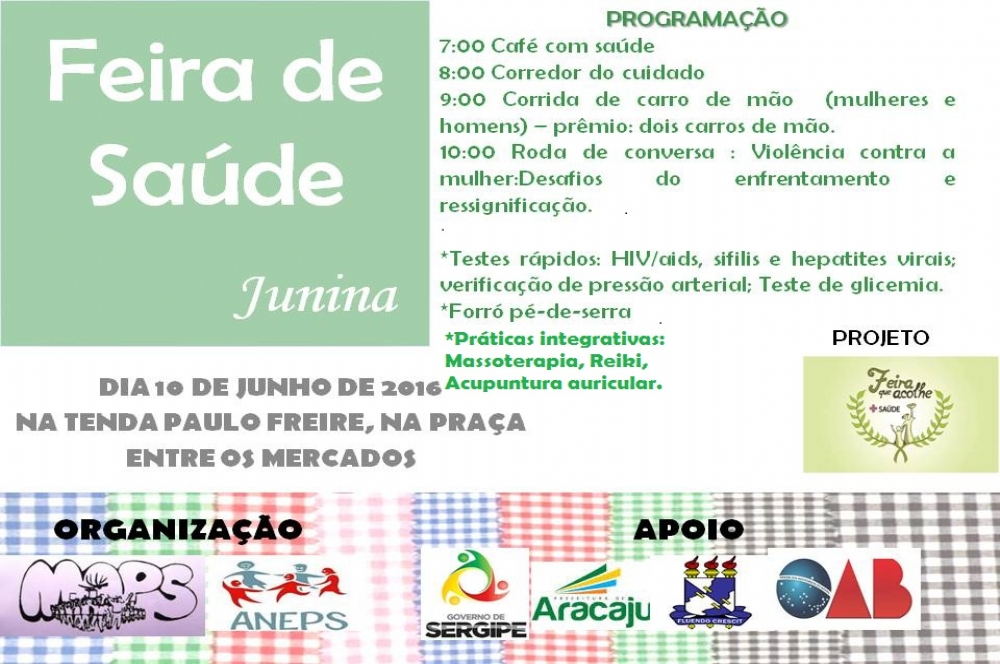 No dia 10 de junho Aracaju sediará mais uma Feira de Saúde, do Projeto Saude na Feira. Esse já é o VI ano do evento que acontece, das 7h às 15h nas proximidades do mercado Albano Franco.