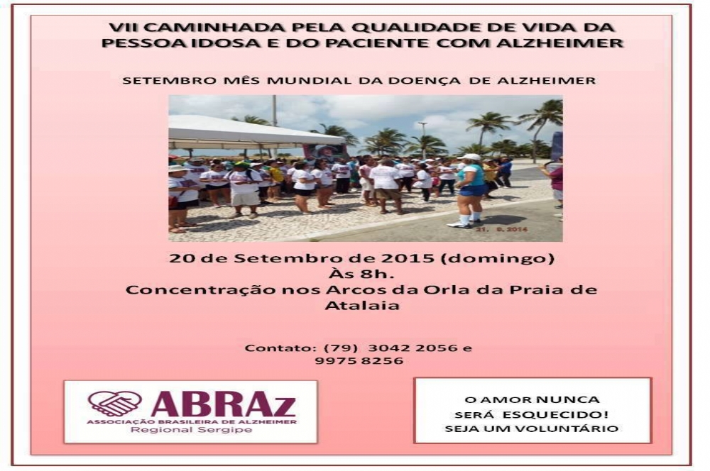 A Associação Brasileira de Alzheimer em Sergipe (Abraz) realiza no próximo domingo, dia 20, a VII Caminhada pela Qualidade de Vida da Pessoa Idosa e do Paciente com Alzheimer. A concentração acontece às 8h, nos Arcos da Orla de Atalaia.