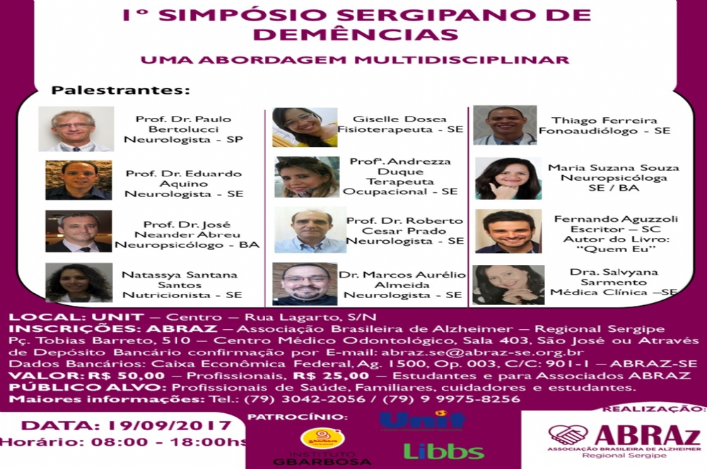 A Associação Brasileira de Alzheimer e outras Doenças (ABRAz/SE) promove o 1º Simpósio Sergipano de Demências. O evento acontece dia 19 das 08h às 18h na Universidade Tiradentes (UNIT), unidade do Centro.