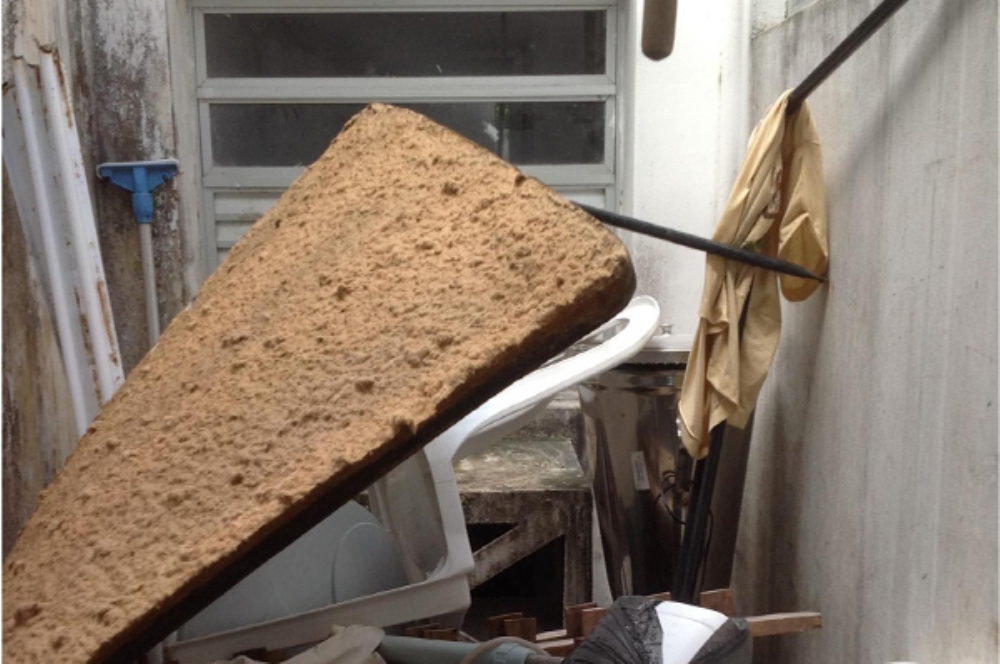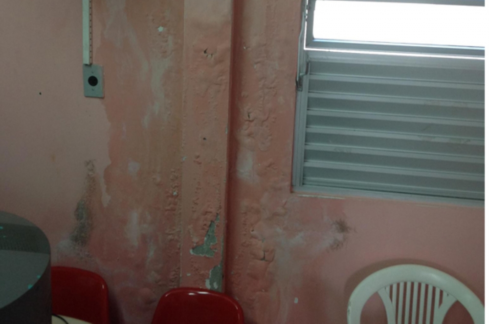 As paredes, conforme revelam os servidores, estão mofadas devido às infiltrações, o ar condicionado está quebrado, fossas estouradas, com fezes expostas no pátio, e o expurgo do serviço está com material velho e muito lixo. “E quando chove, a situação fica ainda mais grave”, revela a enfermeira. “Tudo fica alagado, com a água topando no tornozelo”, observa.