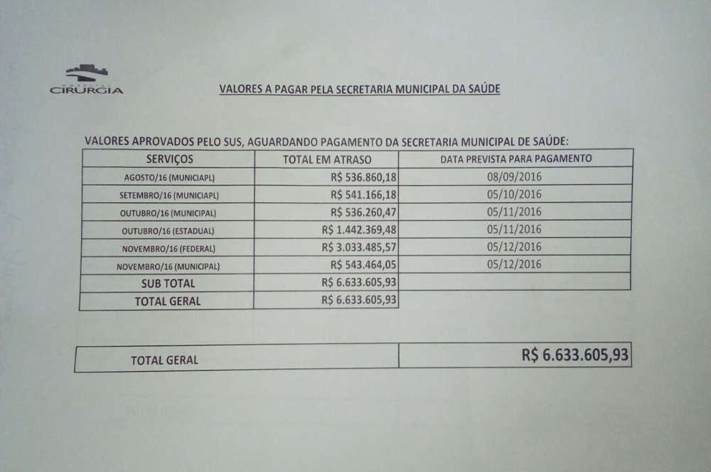 Ainda na última quinta-feira, o Hospital Cirurgia informa ter recebido uma quantia na órbita de R$ 130 mil da SMS, que seria fruto de um repasse estadual. No entanto, o pequeno pagamento não foi o suficiente para que o hospital reabrisse o atendimento ao SUS. Conforme tabela divulgada pelo Cirurgia, a Prefeitura de Aracaju deixou de repassar os valores desde o mês de agosto de 2016.
